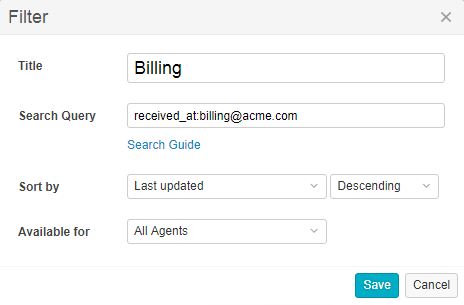 Select who you want this filter to be available to. Everyone, a specific team, or you only. You can change this at any moment. Learn more about filters in Searching tickets and setting up filters article.