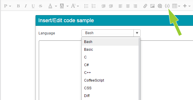 1. Click on the (Insert/Edit code sample) button in your WYSIWYG editor.