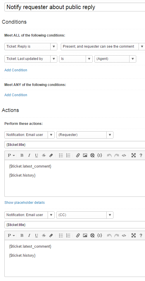 Condition: When a new reply to a ticket is added by agent and it is a public reply (not an internal note), the action is executed.