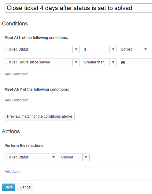 The Time based rule in this example closes a ticket once its status has been set to Solved and not reopened in the last four days.