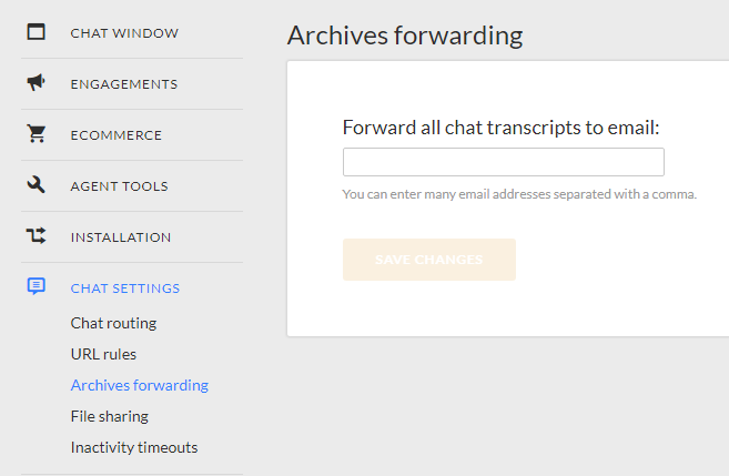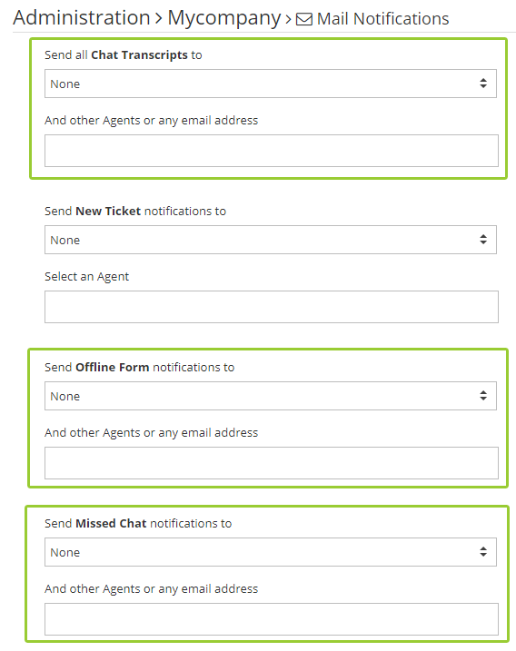 Here you can add emails where chat transcripts, offline form and missed chat notifications will be sent. Insert your support email address here (e.g. go to Settings > Mailboxes in Helprace to see your list of addresses).