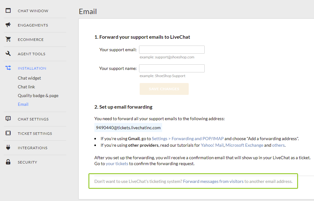 These settings may vary according to chat software. If your chat provider has a built-in ticketing system, these settings may be quite difficult to find :).